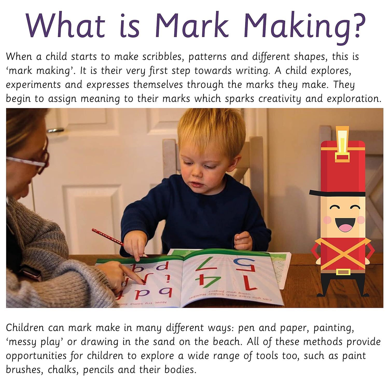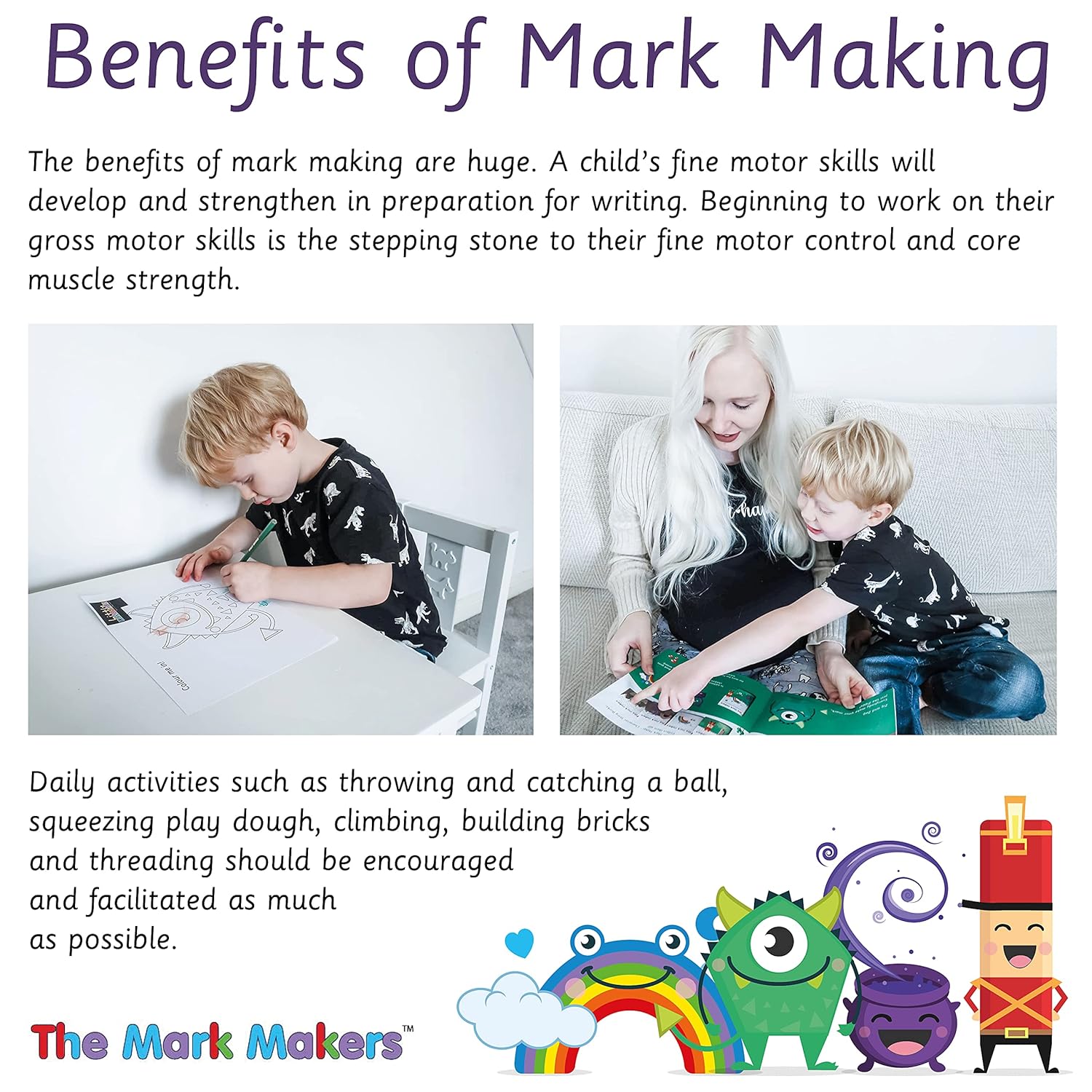 Supports early writing through fun, mark-making characters