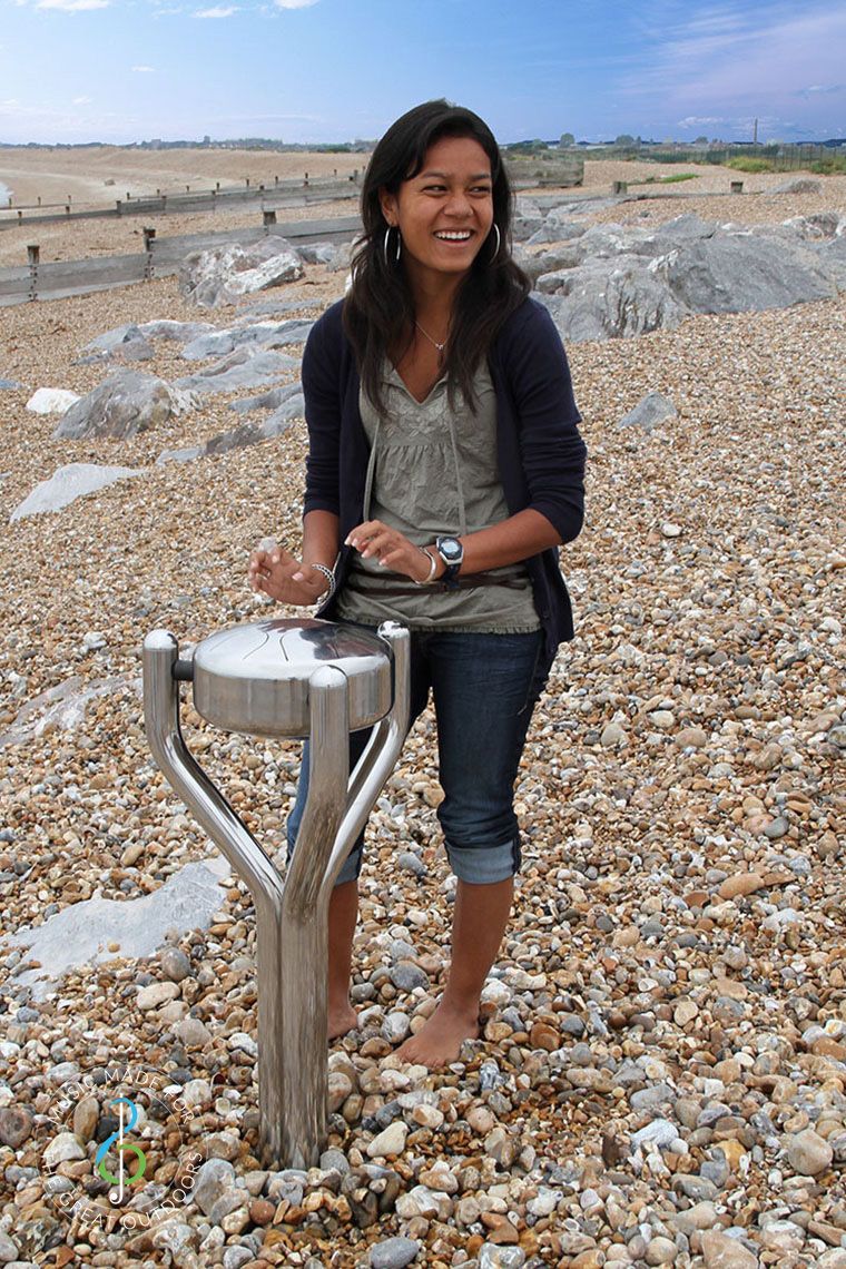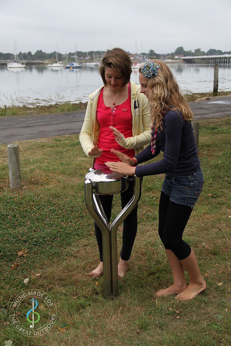 Babel Drums are circular stainless-steel tongue drums designed for permanent outdoor installation. They come in two sizes: