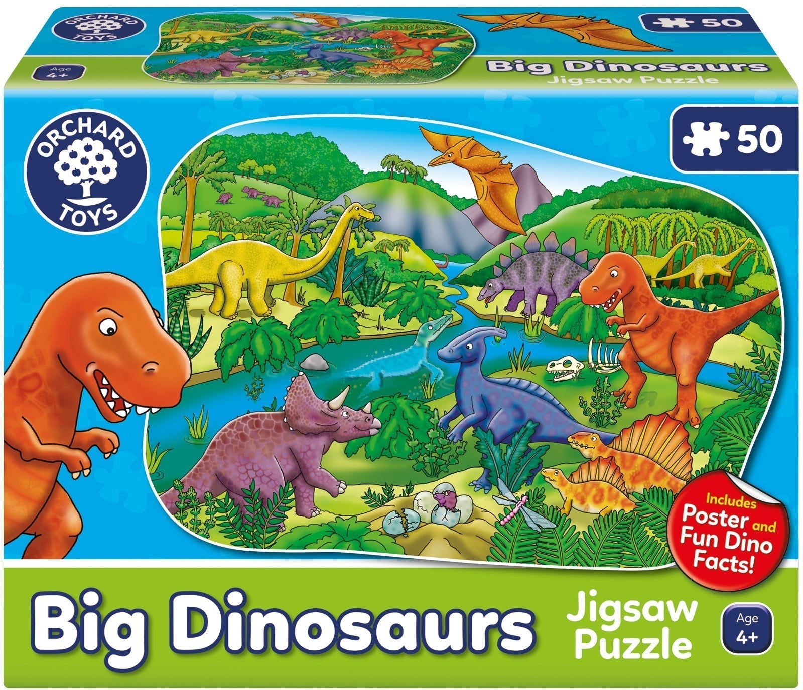 A 50 piece shaped floor puzzle Depicting an array of dinosaurs in a lush prehistoric setting.