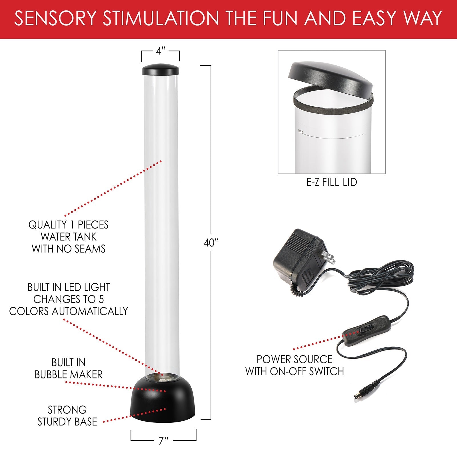 **Please note this is intended for visual stimulation only and is not a toy - Adult Supervision is required**Safety Recommendation: We highly recommend securely fixing all bubble tubes with a bracket, as they can tip over if pushed and may break.We also recommended that the Bubble tube is emptied if not being used for an extended time (Summer Holidays)
