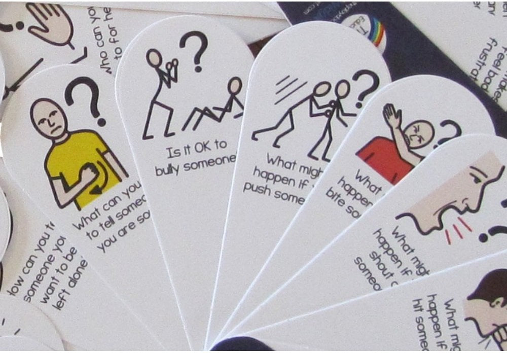 The set progresses to talking about behaviour ‘What helps you calm down when you are feeling cross?‘ and ‘How can you tell someone how you are feeling?‘. These questions progress onto the last fan which looks at ‘What would happen if?‘ and deals with the consequences of behaviour so children can learn appropriate alternative actions.