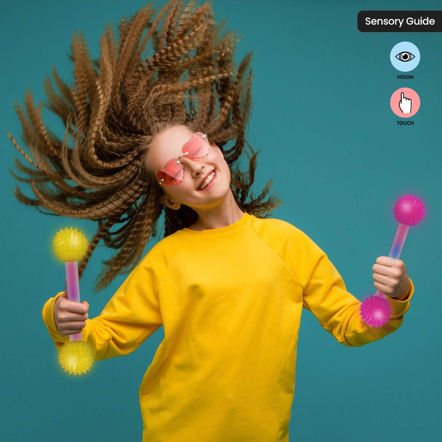 Each baton is approx 43 cm long and has a soft rubber spike ball on both ends which, when tapped, banged or dropped causes the ball and tub to flash for 10-15 seconds before automatically switching off.