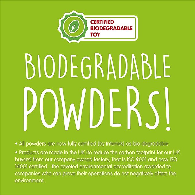Fully eco-friendly productThe Box, leaflet and bags in this product are fully recyclable in standard paper recycling and our powder is certified biodegradable!By adding Eco Gelli Baff powder to water, you create a thick colourful goo. By simply adding a second ‘dissolver’ powder, the goo turns back to coloured water that can be drained away safely and easily. Eco Gelli Play is the perfect product for messy and multi-sensory play! Skin Safe - Drain Safe - Easy Clean - Stain Free - Fully Eco-friendly