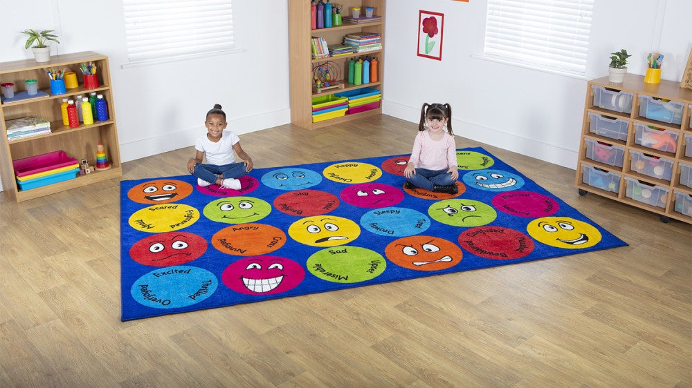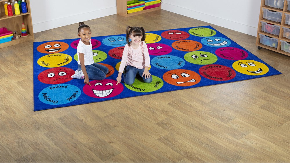 Emotional Intelligence: Distinctive and brightly coloured, this carpet showcases 12 different emotions, creating an engaging platform for learning about feelings. Keywords accompany each expression, promoting emotional intelligence and communication.