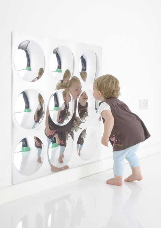 800mm square… this is the original iconic moulded “bubbles” mirror for the school environment. 9 fascinating convex bubbles scatter light and reflections.