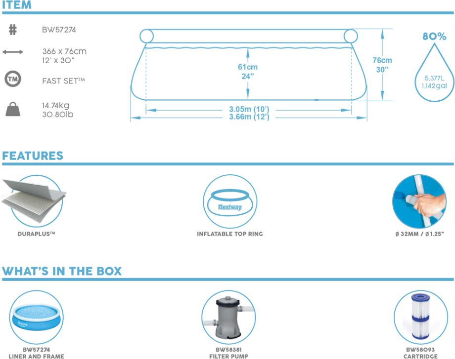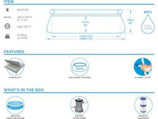 Great for those sunny days splashing around with the family, the Bestway® 12ft Fast Set™ Pool is from Bestway®'s renowned range of quick and easy to set‑up above ground pools. Unlike in‑ground swimming pools which require digging and considerable setup time, a Fast Set™ inflatable swimming pool can be quickly setup on a flat surface. Simply inflate the top ring and watch the pool rise as it is filled with water. Constructed using TriTech™, the 12ft Fast Set™ Pool benefits from a 3 layer reinforced material that provides superior strength and durability for continued enjoyment throughout the summer. Requiring no tools to construct, you will have your pool setup in your garden in no time. Able to continuously filter the 5,377 Litres of water thanks to the 330gal Filter Pump, your pool will stay debris free throughout the summer months. The pool also comes with all the hoses and attachments needed as well as an underwater repair patch in case of any mishaps.The Bestway 12ft Fast Set Pool comes as a complete set; featuring inflatable swimming pool, 330gal filter pump with filter and a repair patchEasy set up within 10 minutes; simply select a level surface inflate the top ring and the pool will rise as it's filled up with waterSimple flow control drain valve for easy draining and disassembly; easily attach hose with the included adapter and drain the water away, ready for storage when not in useMade from durable Tri-tech material for greater strength; water capacity 5,377L, assembled size 12ft x 30" (3.66m x 0.76m)2-year warranty and free delivery; a great set for the summer