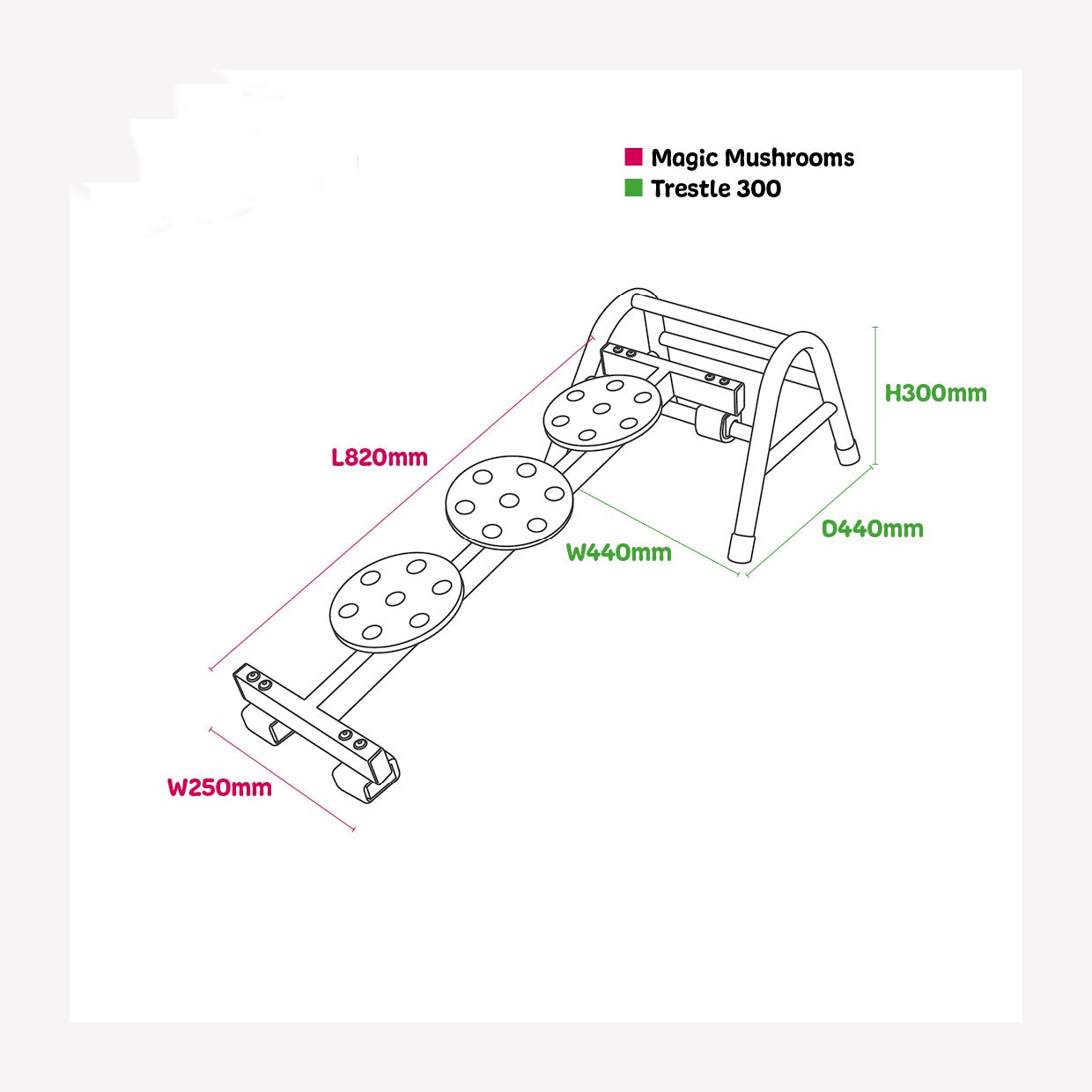 This set comprises the small 300mm trestle with the magical mushroom stepping stones. Hop skip and jump - these magical mushroom stepping stones provide a true challenge for your little one and will help develop their gross motor skills and balance as they navigate both the steps and gradient.