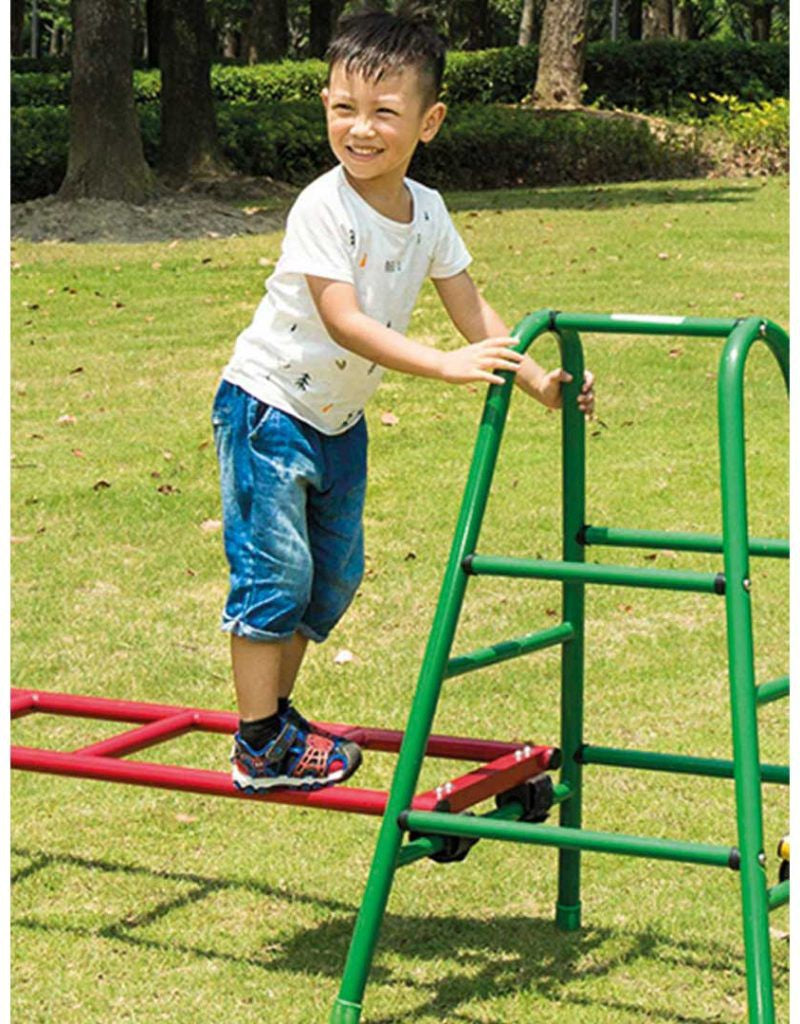 Comprising a 900mm trestle and 1200mm long ladder this gym set is an important option for the development of gross motor skills. Children will need to balance climb crawl bend and stretch as they attempt to navigate the ladder and reach their objective. Depending on the age and level of difficulty required the long ladder can be adjusted and fixed at two different heights using the rubber cleats and hook and loop straps. Adult supervision is recommended and we advise that equipment should be used on natural or impact absorbing surfaces (examples include bark chipping wood sand pea gravel well maintained grass areas or a purpose made synthetic surface)