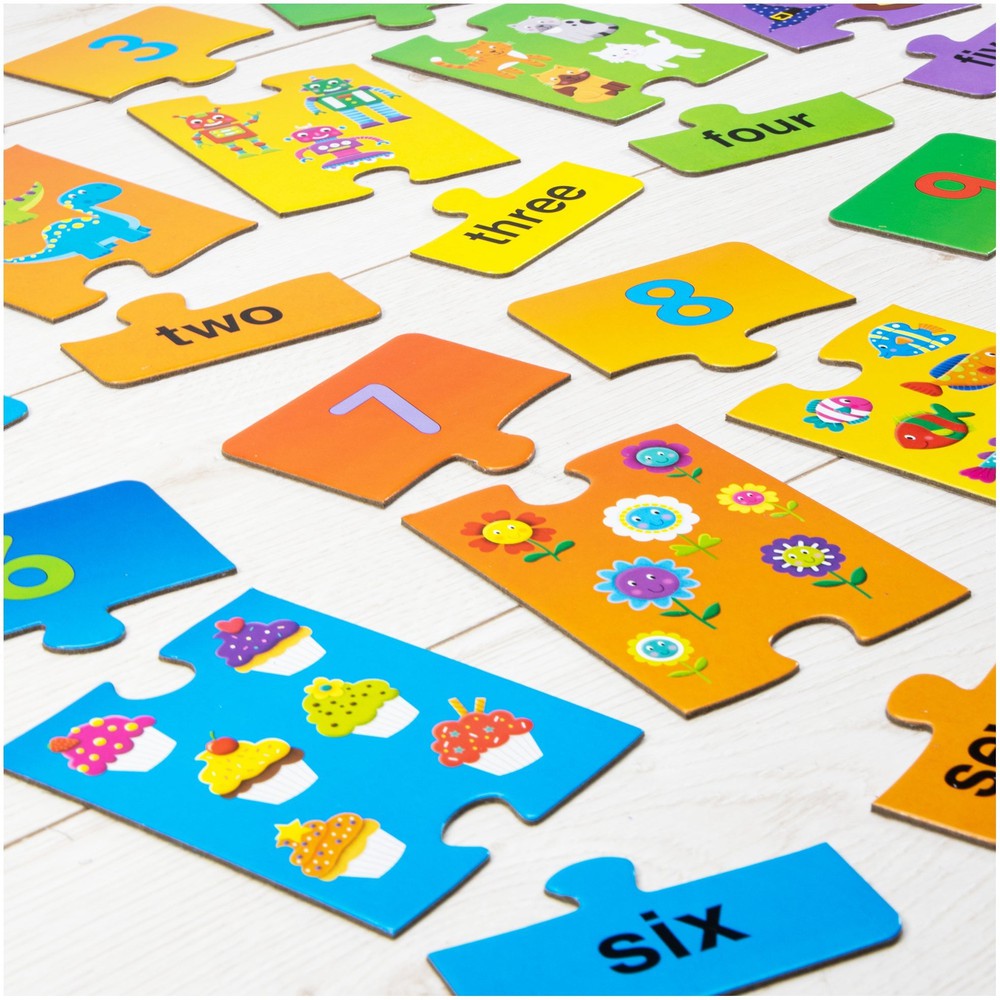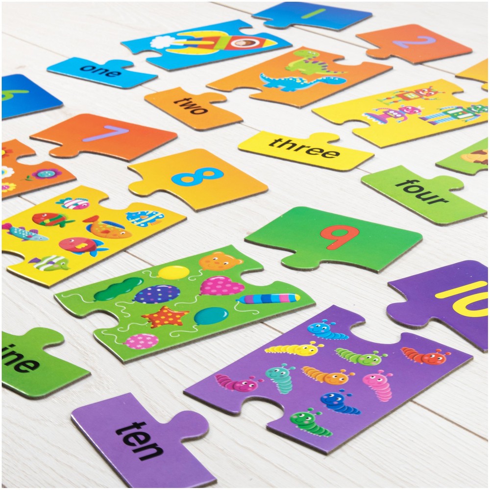 10 colourful 3-piece puzzles to develop early counting skills and number recognition. Each puzzle features a large number the number word and interesting items to count. Only the correct pieces will fit together.