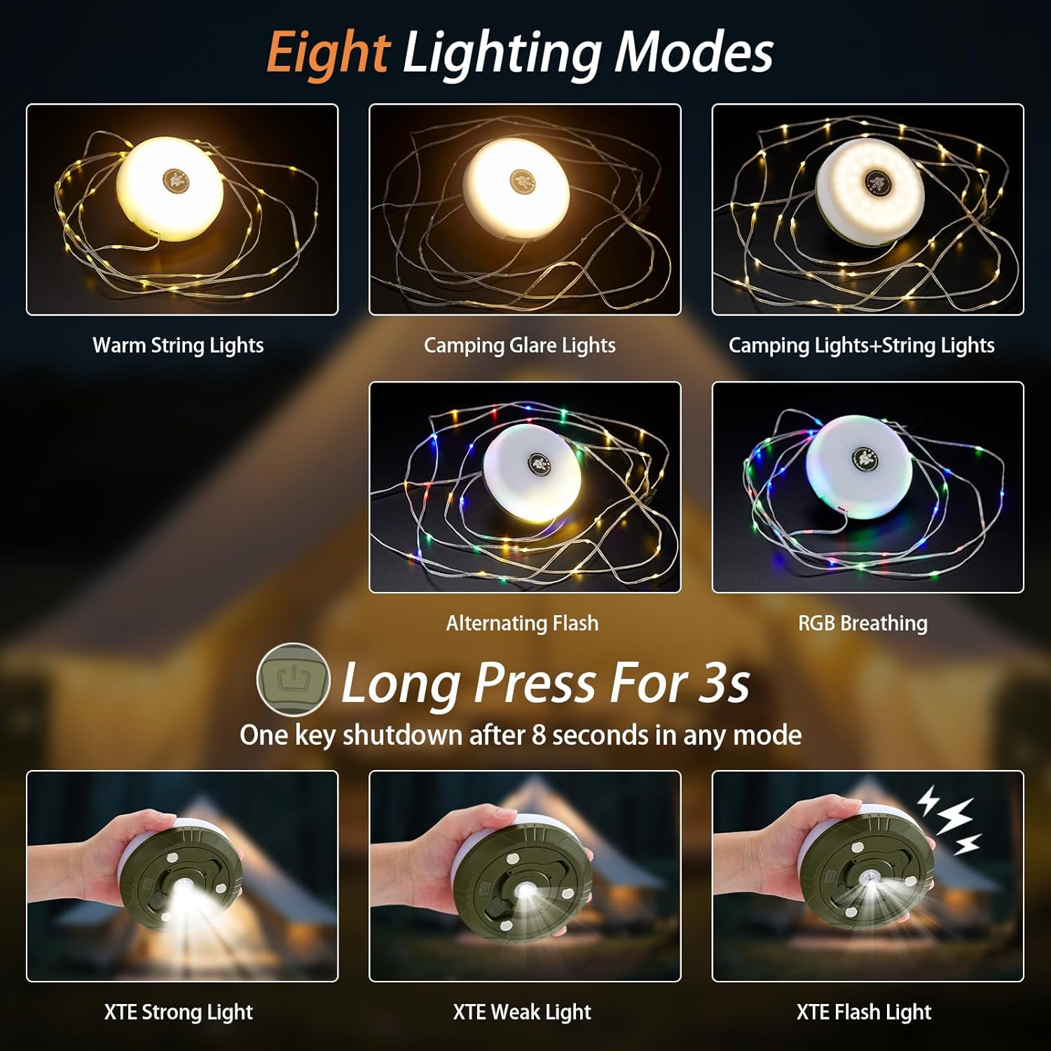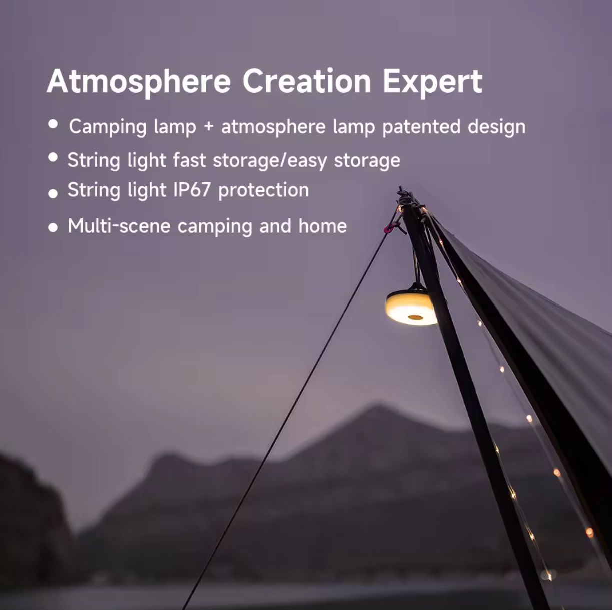 Multifunctional outdoor lighting device combining a 200-lumen main lamp with a 10-meter ambient string light. It features a patented hand crank for retracting the string light, IPX4 waterproofing, and a 1800mAh rechargeable battery