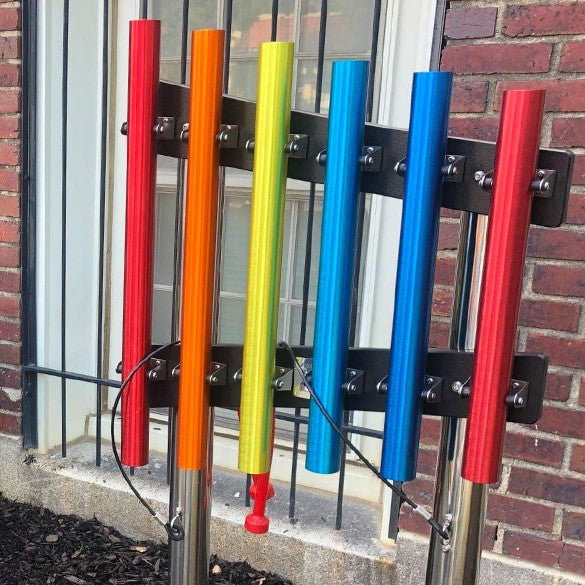 These chimes' size and vibrant colours make them especially suitable for smaller establishments like nursery schools, pre-schools, and kindergartens. They are easy to securely install in the ground, on a wall, fence, or post. You can even bring the outdoors in by mounting them on an indoor wall.