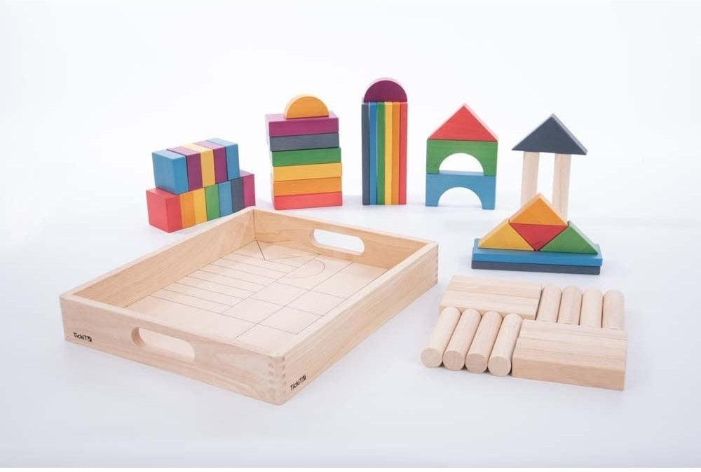 A generous selection of colossal, smooth, solid wooden blocks in classic shapes and a mix of natural and rainbow hues. These wooden building blocks are perfect for construction and stacking play, helping cultivate fine motor skills and coordination -- as well as stimulating imaginative fun! Comes with a sturdy wooden tray for easy storage, featuring guide lines to make packing the blocks back a breeze.