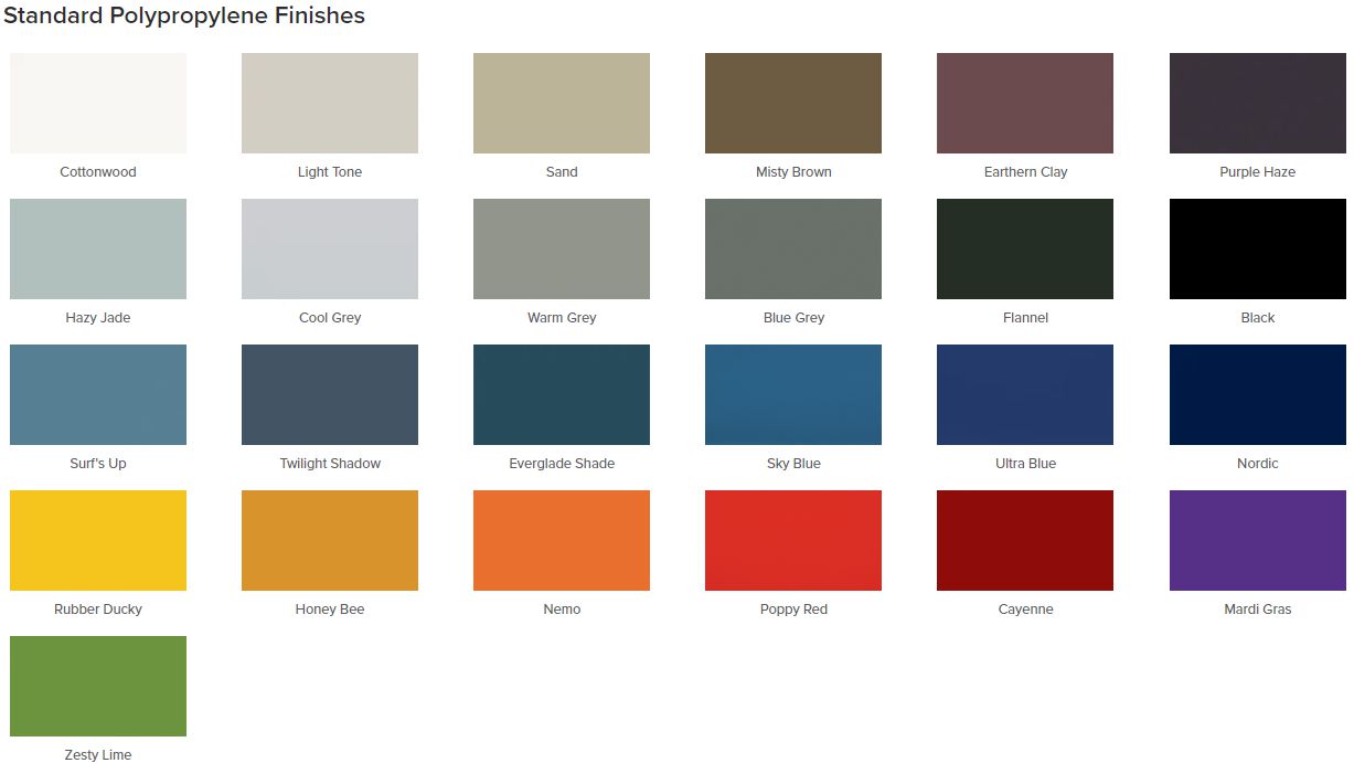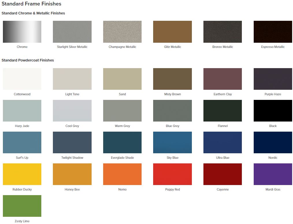 • Customizable Options: Choose from a wide range of 25 standard poly colours and 31 frame finishes to match your preferences and existing décor. If your desired combination is not Selectable, contact us for a personalized quote.