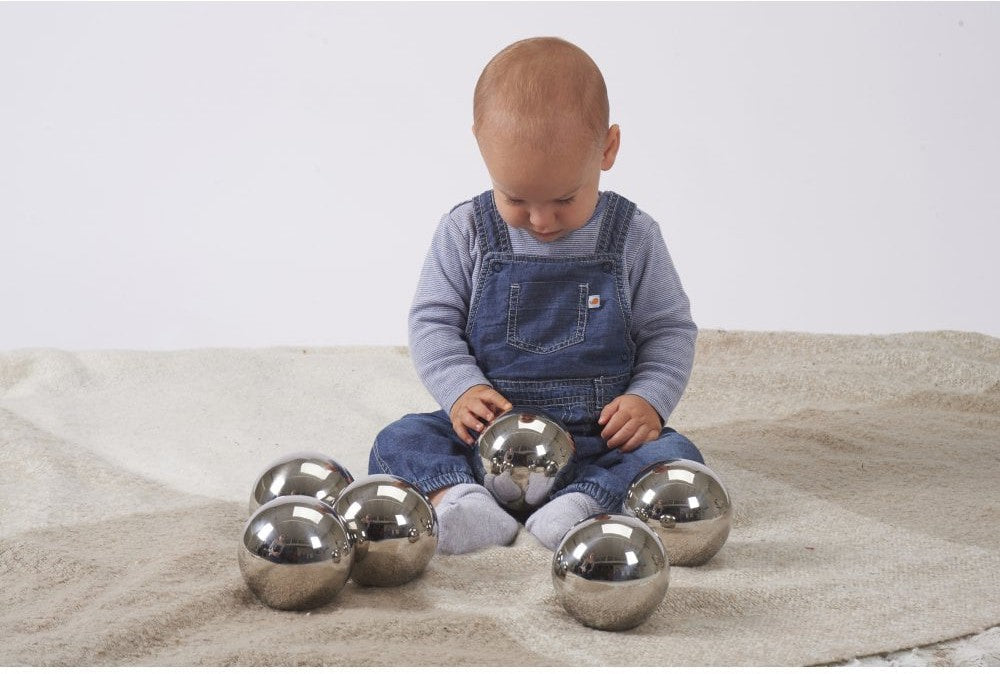 Built tough from stainless steel, these 6 shimmering mirror balls appear indistinguishable, but each has its own personality. When rolled, some may wobble; two are quiet, but one veers off course. Give them a twist, spin, or shake and you'll feel different contents and hear an array of shaker and rattle sounds.