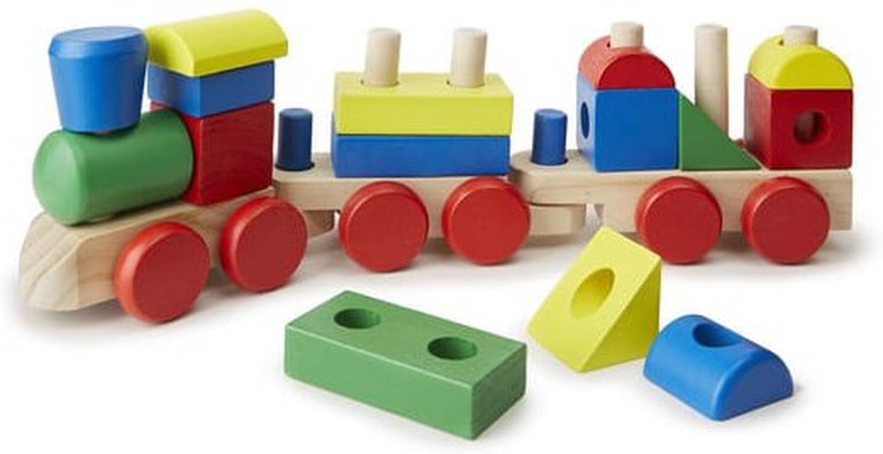 Contents: 1 wooden engine, 2 carriages, 15 colourful stacking blocks