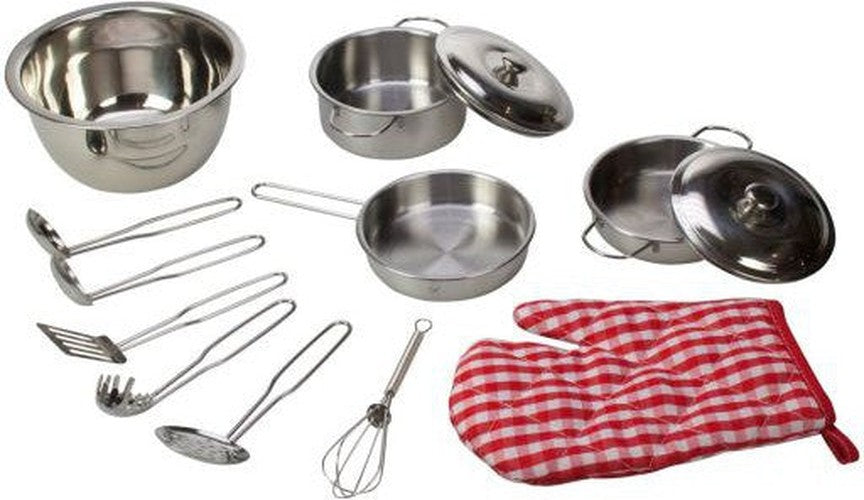 The stainless steel pots, pans, and ladles come complete with a handy gingham oven mitt. A great way to educate little ones about every step of preparing, creating and cooking in the kitchen!