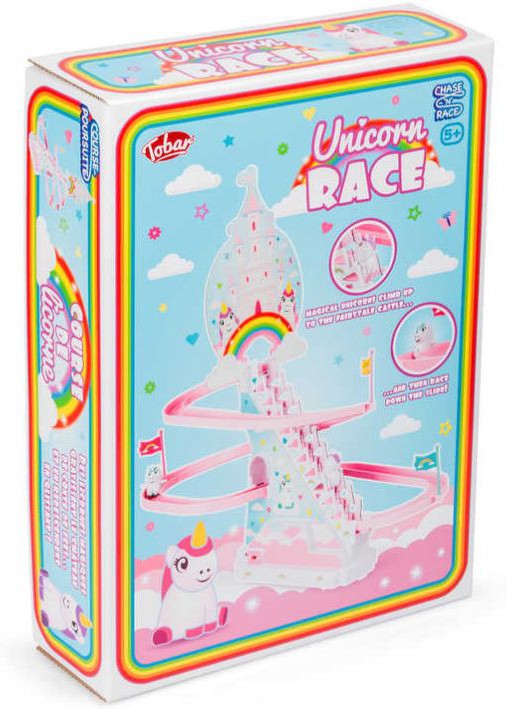 Interactive Racing Fun: Spark excitement by pressing a switch to set three charming unicorns off on an exhilarating race! Watch them climb the ladder and swiftly slide down the winding path. Release the switch, and they take a breather, ready for more fun.