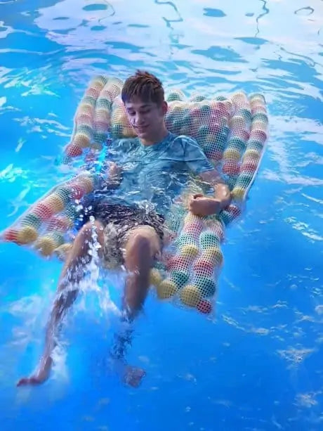 The Big Citrus PocketĀ is a large rectangle, 20 balls long and 9 balls across on the outside with one big pocket of small balls in the middle that allows you to sink more into the water but still giving you the same level of support as the original Big Citrus for one or two people.