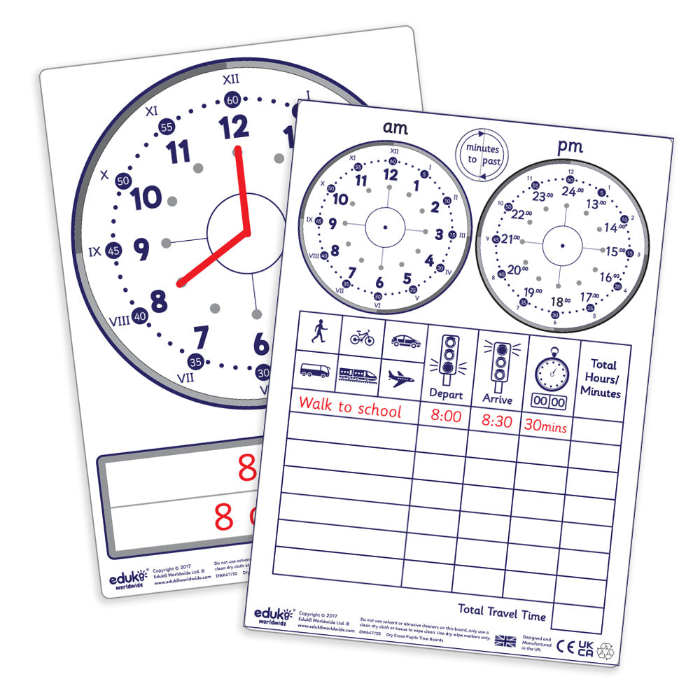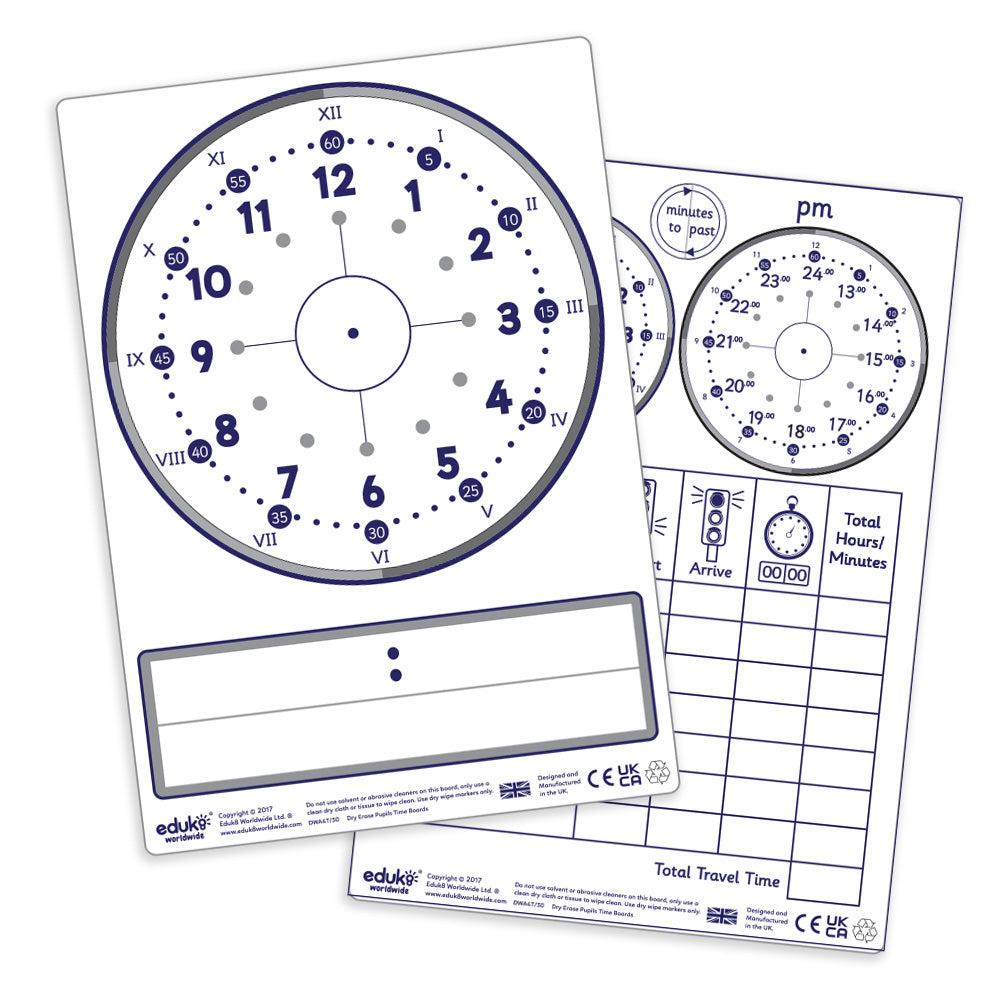 A combination of dry erase linear 12/24 elapsed time rulers and conventional analogue clock face with a time table grid on reverse. The linear 12/24 hour analogue/digital elapsed time ruler enables students to calculate elapsed time in a simpler way by marking start and finish time using dry erase markers, therefore calculating start and finish time.