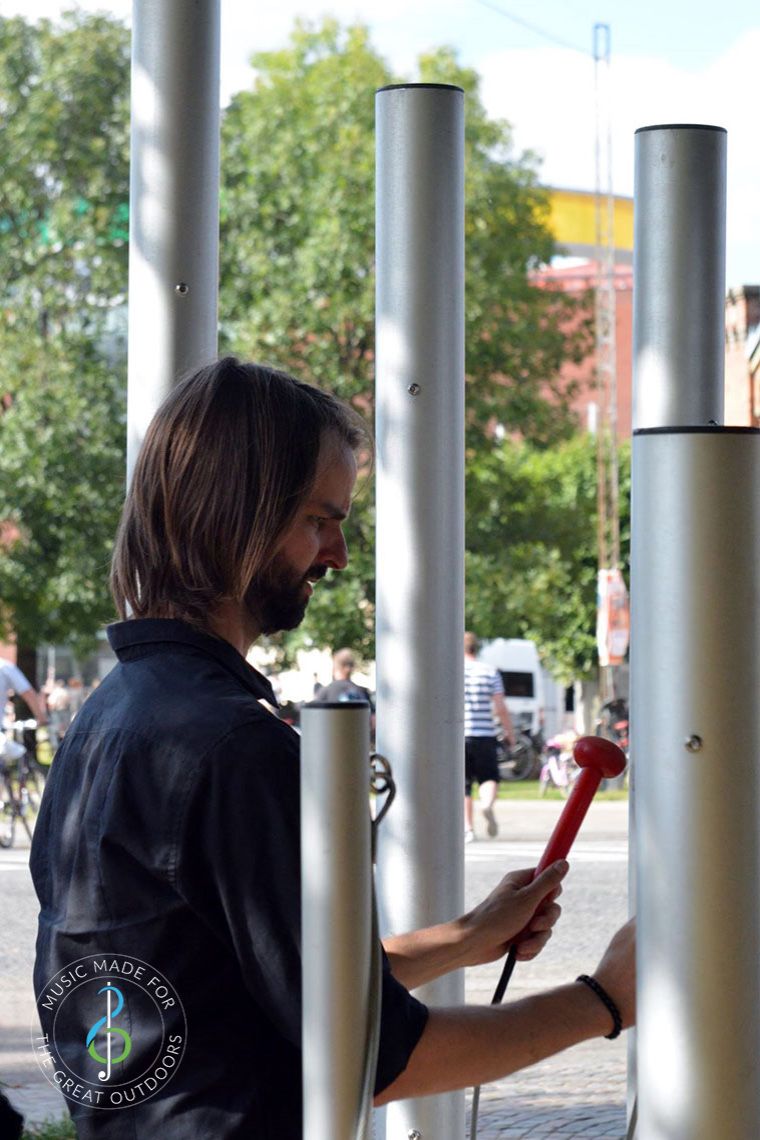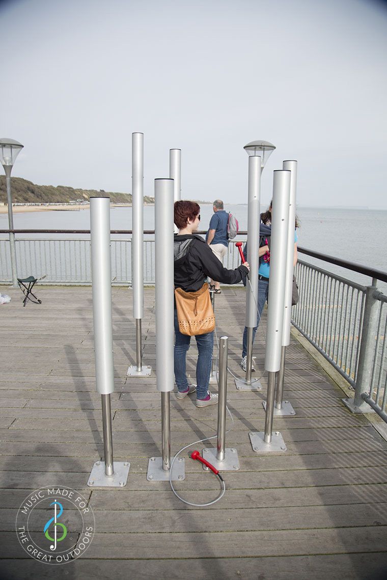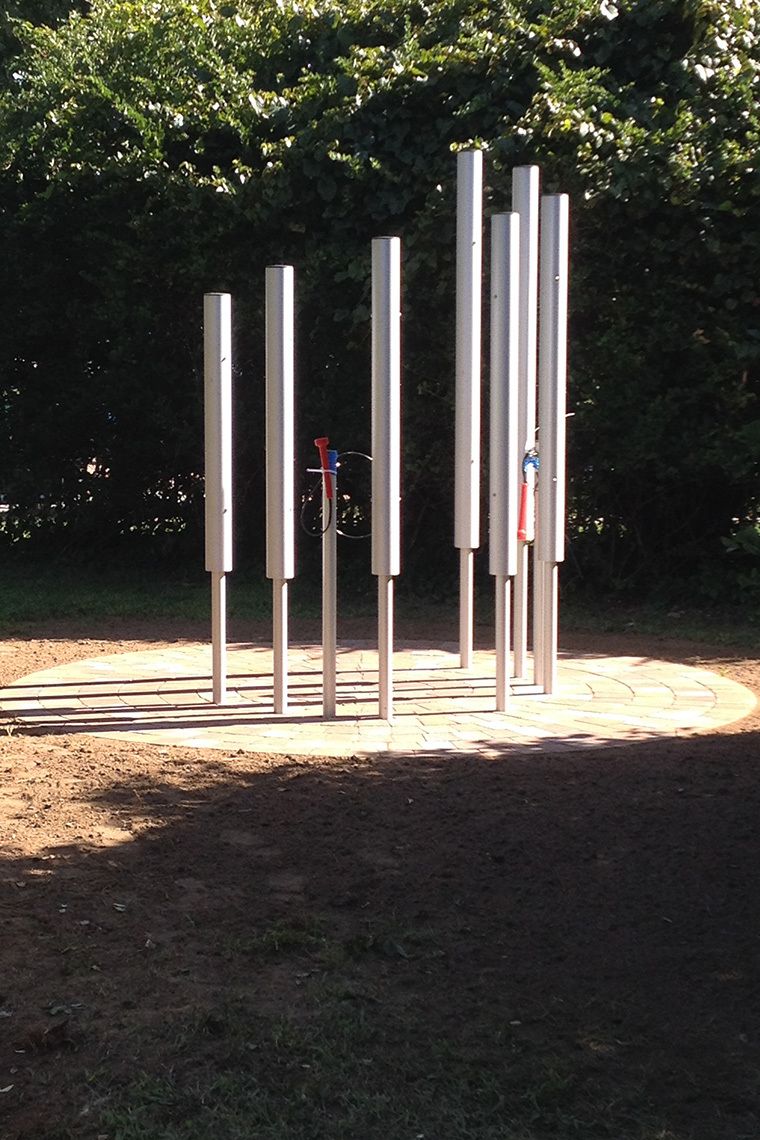 This set of seven aluminium 'bells' ranges from 1.6m to 2.2m in height, all with a 100mm diameter and pentatonically tuned from A3 to C5.