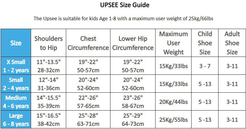 Suitable for children aged 1-8, with a maximum user weight of 25Kg/33lbs. Approximate size by age: